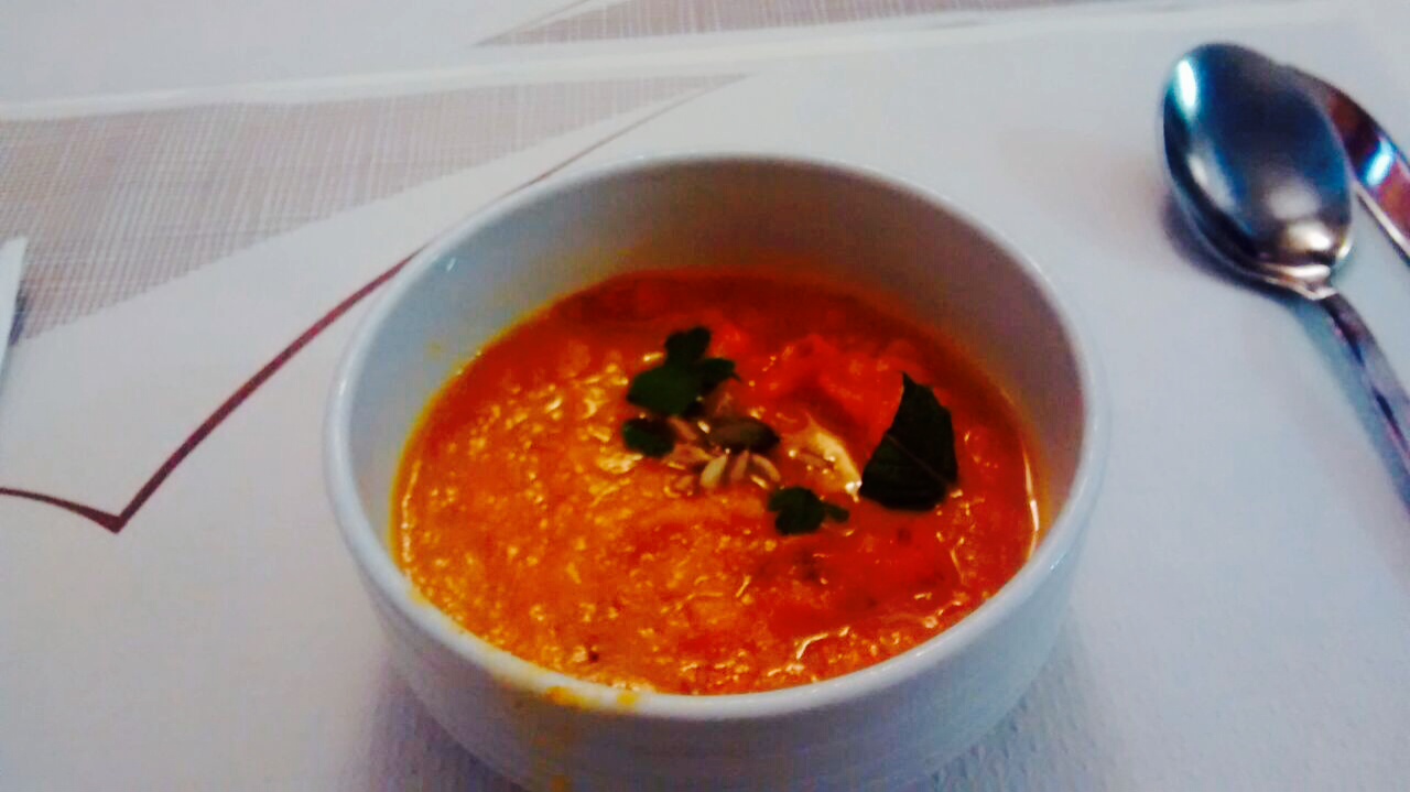 Sopa de miso blanco con alga wakame, zanahoria, rábanos, arroz integral y azukis.
