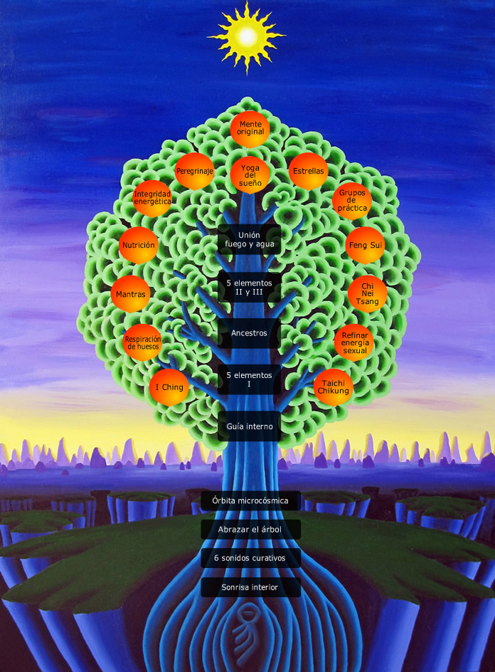 El alineamiento creativo de la estructura ósea iniciado en el Nivel Introductorio con la postura de Abrazar el Árbol se amplía y se profundiza ahora con otras cinco posturas. Estas posturas ayudan a estirar el tejido conjuntivo, una capa de micro-meridianos que envuelve cada uno de los órganos y de los músculos en un opulento océano de energía. También se ven estirados diferentes conjuntos de meridianos y de tendones que van de los dedos de los pies hasta las manos.