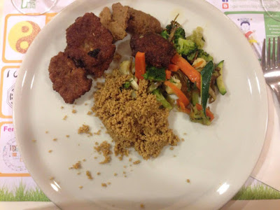 Se cortan las zanahorias en dados pequeños, y también en trozos pequeños la coliflor, el brócoli, la alcachofa y el calabacín. Se corta el seitán en trocitos, no necesita mucho, sólo es para darle un sabor rico.
