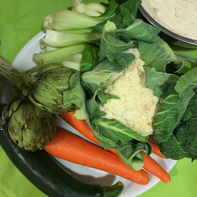 Se cortan las zanahorias en dados pequeños, y también en trozos pequeños la coliflor, el brócoli, la alcachofa y el calabacín. Se corta el seitán en trocitos, no necesita mucho, sólo es para darle un sabor rico.