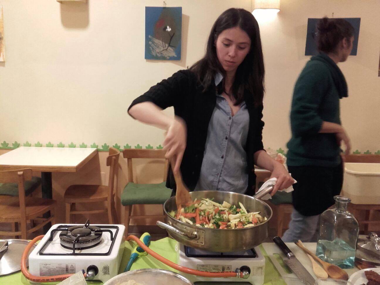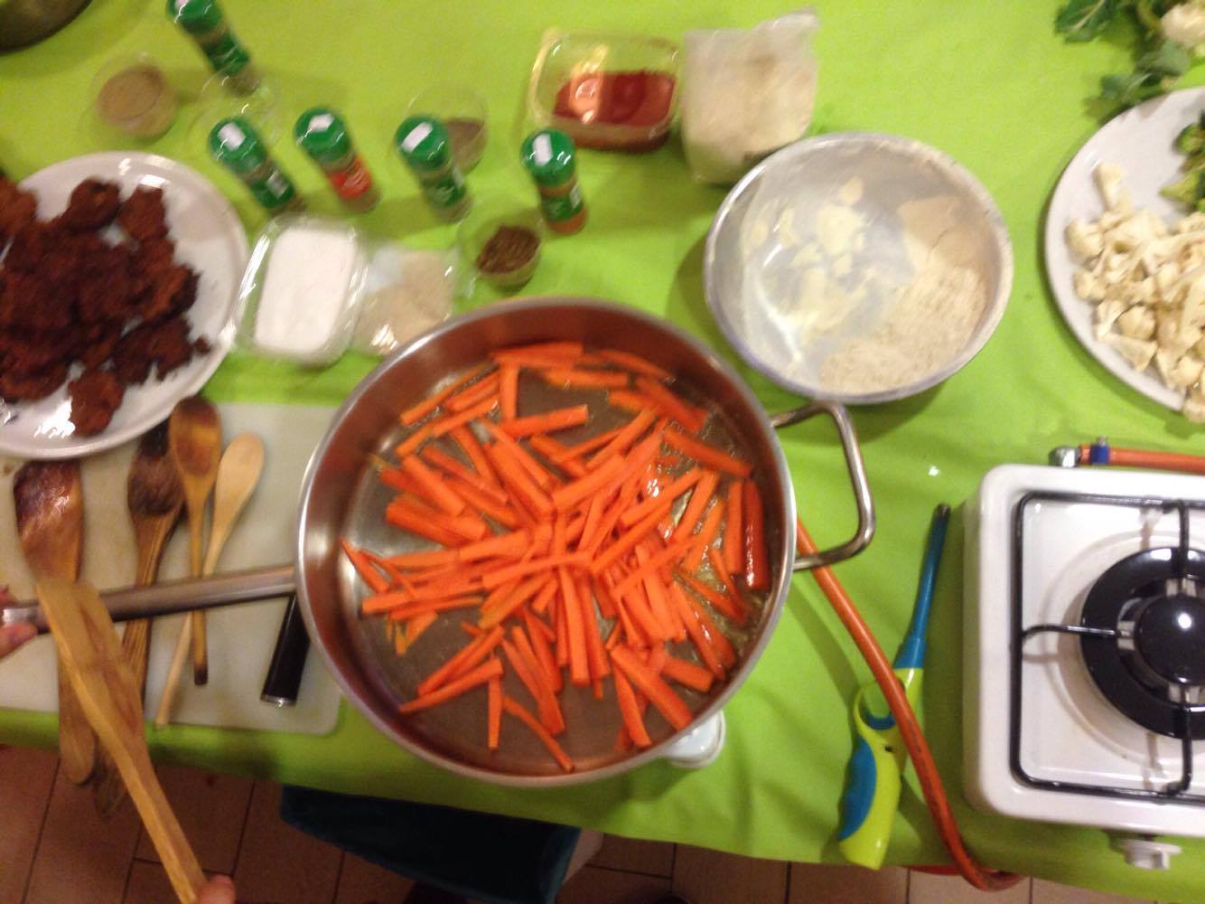 Se saltea el seitán y vamos agregando poco a poco todas las verduras cuidando de ir echando primero las verduras que más tarden en hacerse. Y se le añade una cucharadita de café colmada de 5 especies y una poco de sal.