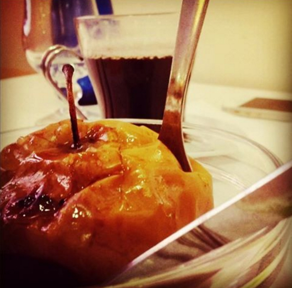 Se pone a hervir las manzanas troceadas en una taza de agua, con la pizca de sal y la canela. Una vez hervidas, con el agua de hervirlas, hacemos una salsa agregando el jugo de manzana arru-rruz diluido en agua fría. Se tuestan las almendras lijeramente y se reserva. Se sirve en el cuenco con la salsa de manzana y las almendras por encima.