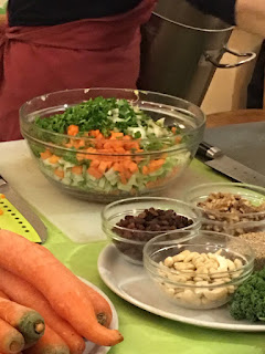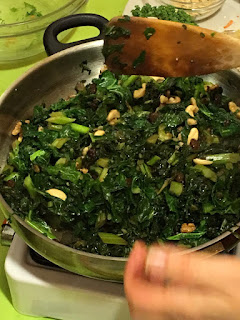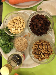 Preparación: Poner la sartén con una pincelada de aceite, poner los frutos secos excepto las pasas, remover un par de minutos, cortar en trozos las hojas de kelp y poner todo junto en la sartén con unas gotas de agua y el shoyu. Remover hasta que este hecho.