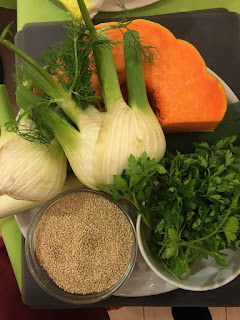 Un vaso y medio de quínoa, 3 de agua, 2 raíces de hinojo, 1 puerro, manojo de perejil, y una rodaja de calabaza.