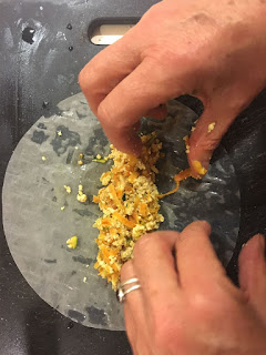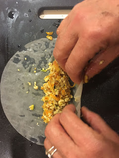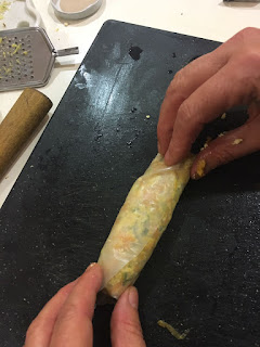 Poner en la parte del papel más pega a ti, las tiras de zanahoria, quinoa, lechuga y brotes de alfalfa, dejando un borde a los dos lados de 2 cm. Doblar los bordes de los lados hacia adentro. Enrollar el papel de arroz apretando, para que quede bien firme.