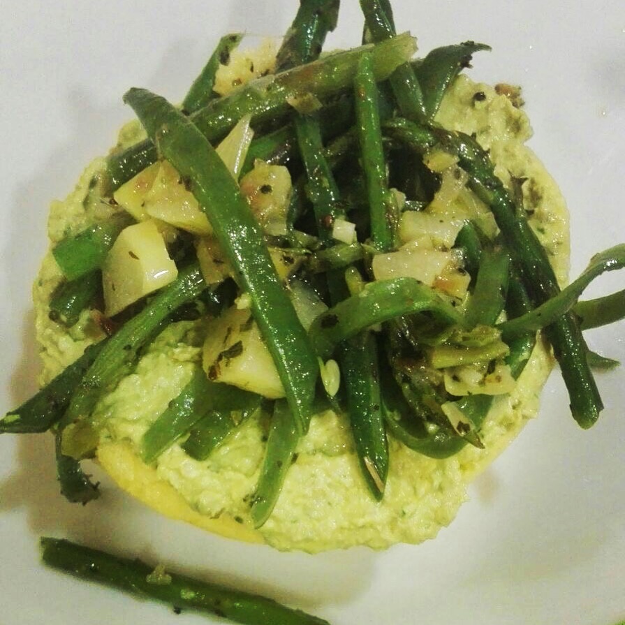RECETA VEGANA: Timbal de polenta con verduras salteadas y hummus de guisantes
