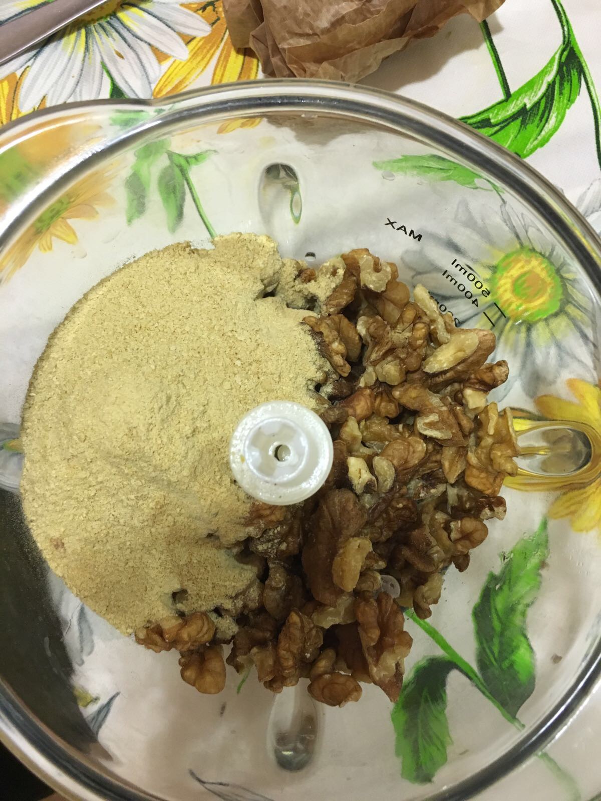 Colar las nueces.Triturar todos los ingredientes hasta conseguir una consistencia moldeable.