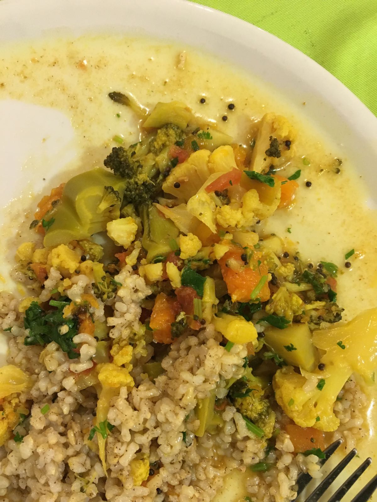 Incorporar las verduras troceadas, rehogar unos minutos, echar la leche de coco y cocinar unos minutos, cubrir con agua para que cueza hasta que las verduras estén en su punto. Picar el cilantro y añadírselo antes de servir.