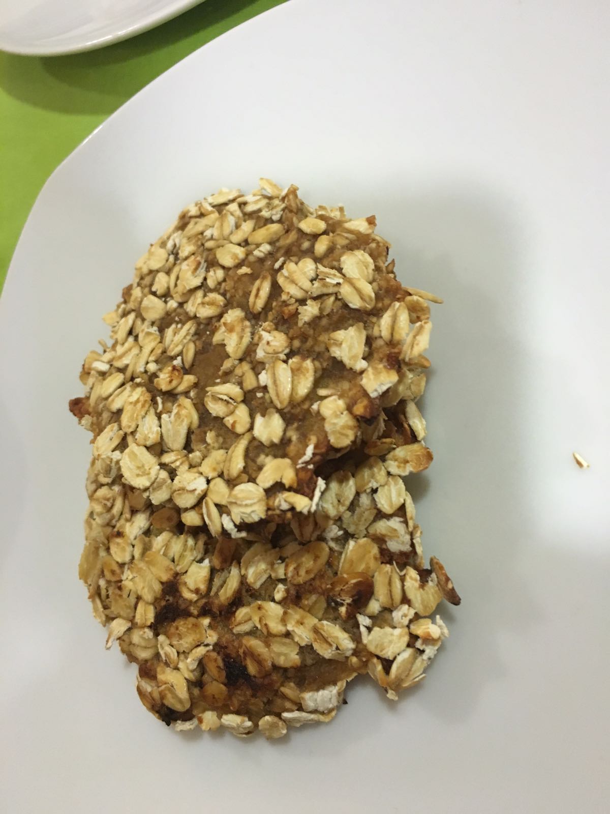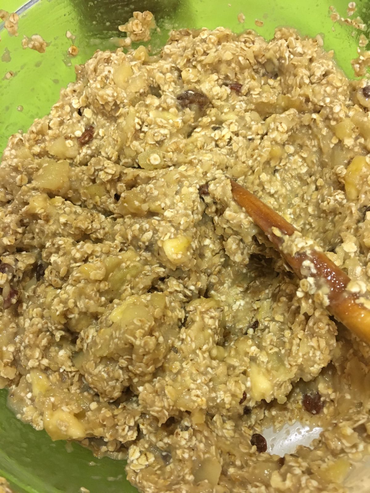 Machacar el plátano. Añadir la compota (que previamente habremos hecho). Incorporar las pasas y sirope. Se añade la avena hasta conseguir una pasta algo blanda. Hacer pastelitos con la masa, aplastar y rebozar en copos de avena. Hornear unos 15 minutos a 180º.