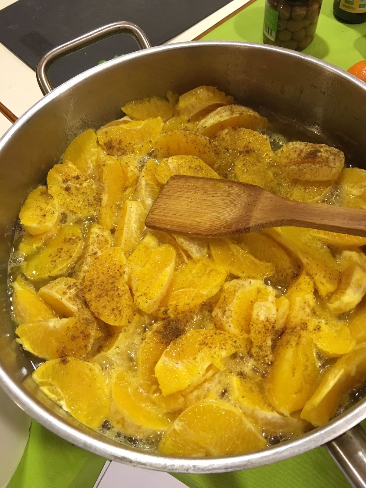 Palar las zanahorias con un pelaverduras, y cortarlas en tiras finas, que se colocarán en la ensaladera o plato a servir. Poner las pasas a remojo en agua caliente, mientras preparamos el resto. Pelar las naranjas y quitar la parte blanca. Cortar las naranjas en trozos que se pondrán en una sartén con el comino y el sirope, sin aceite.