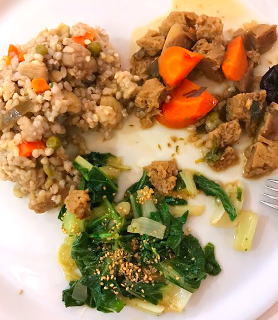 Se corta el seitan en cubos grandes, se cortan las verduras en trozos grandes, se saltea en la olla con el aceite, se agregan las almendras el laurel el tomillo y kombu, se rehoga un par de minutos. Se añade un poco de agua, con el shoyu diluido en ella y el vino. Se tapa y se lleva a cocción una hora a fuego lento. 10 minutos antes de retirar se añaden las ciruelas. Es un plato de proteína vegetal fácilmente digerible para calentarse y nutrirse en los días de invierno.